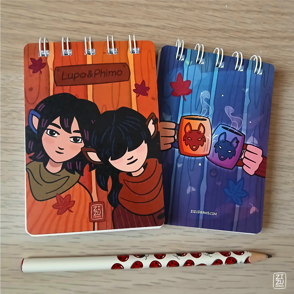 Lupo & Phimo are sisters, one of my original characters, partially human and wolves. If you love piece, nature and coffee, get one of these notebooks! Wherever you go, in any season, Lupo & Phimo will always bring along a nice and cozy atmosphere ^^